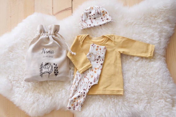 * een mooi linnen zakje (22x30 cm) voorzien van naam een geboortedatum. Het linnen zakje kan gebruikt worden om speciale dingen uit de kraamtijd in te bewaren, denk aan het eerste speentje, het geboortepakje, etc. Of het kan gebruikt worden om een setje reservekleding in te doen.